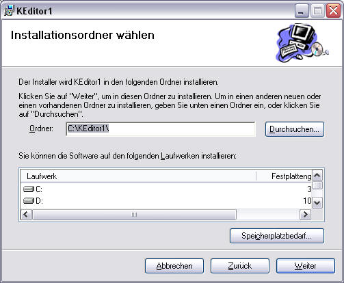 Achtung: Ändern Sie bitte den Installations-Ordner in <LW>:\KEditor1\ und drücken Sie [Weiter].