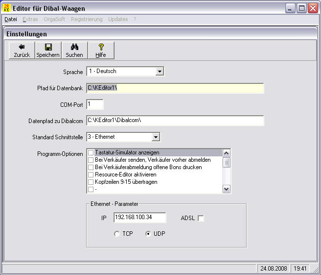 Ethernet - Parameter | IP - Die IP-Adresse der Waage Kommunikation per UDP ist Standard ADSL nur aktivieren bei Steuerung über das Internet |